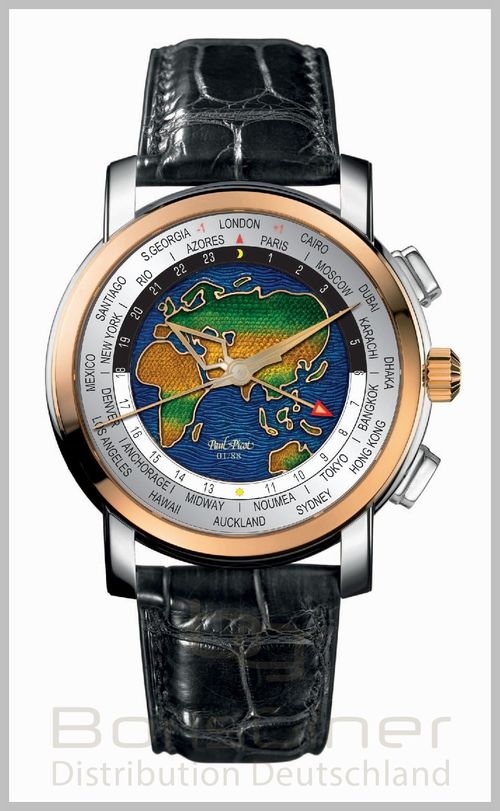 | Funktionen | Automatik mit Megarotor aus Wolfram, GMT, 2.Zeitzone, hand emaliertes Ziffernblatt, nummeriert und limitiert auf 300St. |