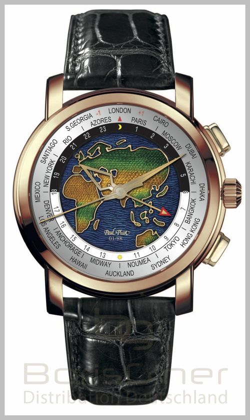 | Funktionen | Automatik mit Megarotor aus Wolfram, GMT, 2.Zeitzone, hand emaliertes Ziffernblatt, nummeriert und limitiert auf 300St. |
